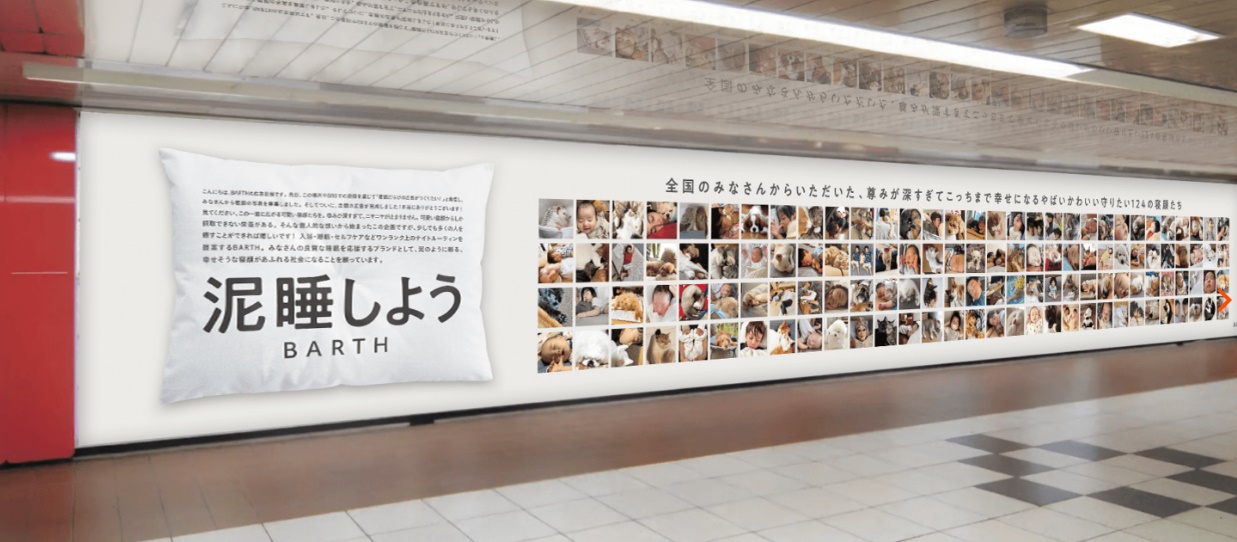 BARTH「寝顔募集」キャンペーンのOOHに、新宿メトロスーパープレミアムセットを活用して巨大ポスターを掲出(2023年)。 一般公募で集まった124名の寝顔写真を駅貼りポスターとして掲出。単なる「いい話」に留まらず、SNS上でのツッコミや大喜利を誘発する「余白」が拡散を後押しした。